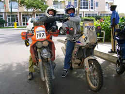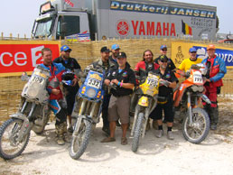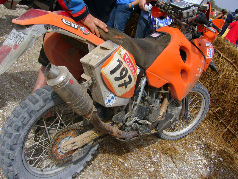 They lined us up in groups of 20 starting with a reverse order. Steve and I were in the third group. Even before we left there were guys falling over in the sand and others getting stuck axle deep in the beach. I doubt anyone was bummed about either. When the first group left there were 6 helicopters following. The starter lit a flare and it was a 5km drag race down the beach. It reminded me of my first harescramble when I watched an entire row of bikes leave in a split second under a cloud of sand and smoke. The choppers all left in sync riding along with the bikes only 50 feet off the ground. The moment was just electric. I sat on the line and talked with a Czech rider that was reaching the finish for the first time. He had tried three times before and gone out each time for various reasons. He filled me in on his race and told me about day 5 when he was almost knocked out by a sideswapping car. He got hit by an over zealous driver and thrown onto the dunes. The bike didn’t fair so well but he fortunately was able to limp it back to the bivouac. Everyone had a story. Each bandage and strip of duct tape was a potential race-ending event. It is a minor miracle that anyone makes it at all.