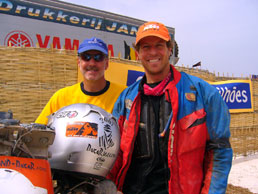 So Steve and I made a plan to head to the surf as soon as the flare lit. Line three was off at 1020 and I got the jump. Steve immediately veered right away from the surf and he started hauling ass on the fresh dry sand. After a marginal start he made up some time on the inside and stuffed a few guys in the first turn. I played it safe and watched as the subframe shook itself to pieces. I quietly talked to it and politely asked it to just stay together, please. Approaching the first couple turns inland we are met with the same dunes we rode in on only now they were lined with thousands of fans. I took the outside line and squared off the turn and just barely saw Steve put a foot down for the next left. With his full tanks the 525 was a handful. I saw a hole on the inside of turn two and grabbed the lead from Steve in our own little race. For the first time since Lisbon I saw Steve put on his race face and let a rip. It didn’t take long for him to pass me back and in a few short moments he was gone toward the finish. The deep sand eventually gave way to really fast fun gravel road for the last 5km. That was seriously the greatest part of the entire race. The screaming people and the first glimpse of the Lac Rose is a memory I will never forget. I slid and drifted to the finish not far behind Steve and when we brought it to a stop we both just shook hands and smiled. It was done. I was completely in my own world.